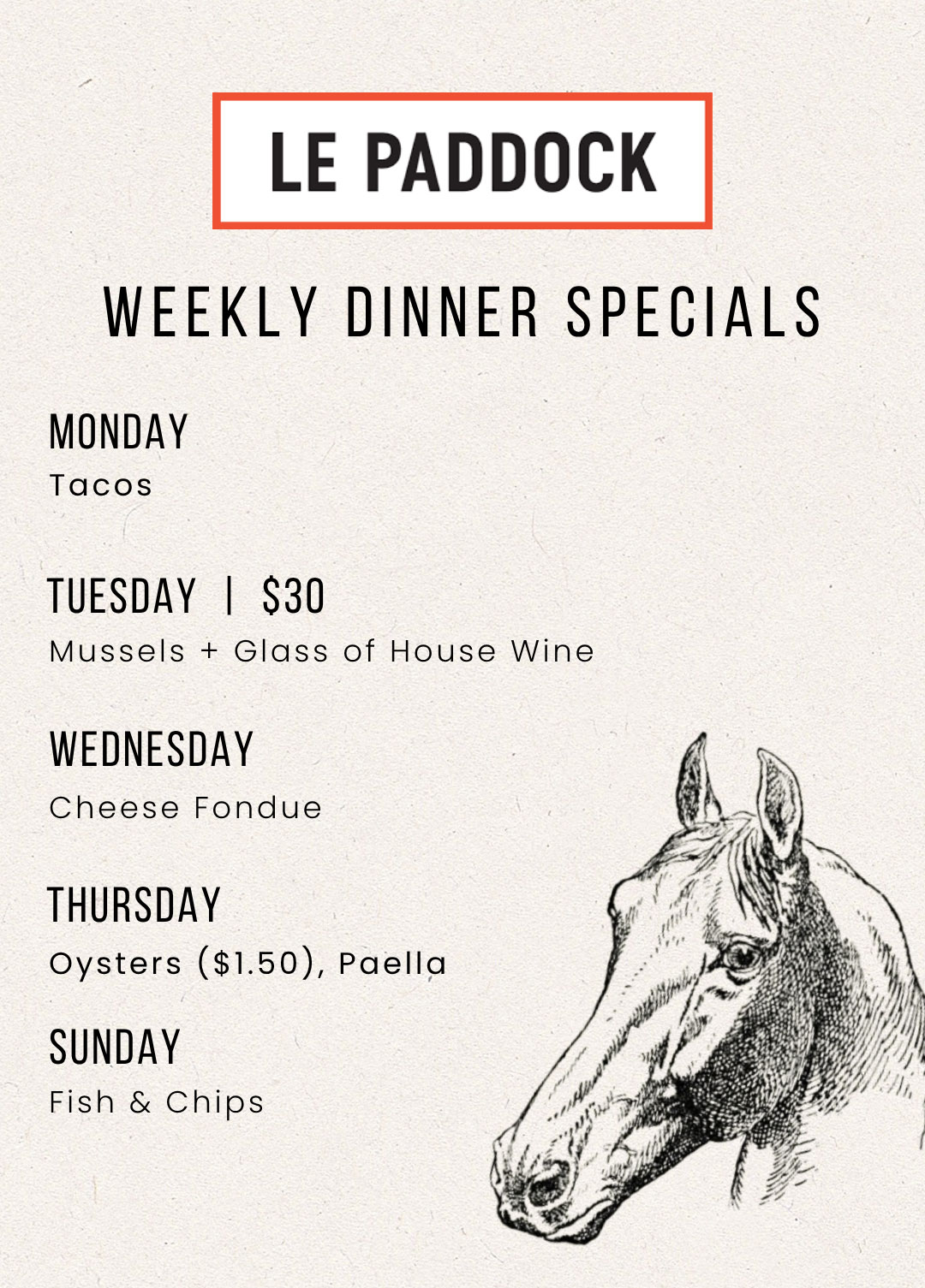 DINNER: Sunday — Thursday 4:00pm – 9:30pm